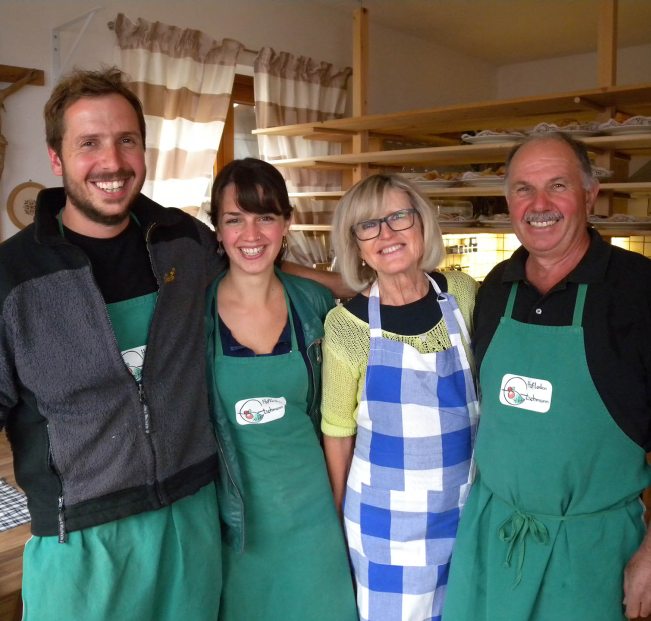 Alle gemeinsam an einem Strang ziehen - das wird in unserem Familienbetrieb in Gargazon groß geschrieben. Ich, Joachim, bewirtschafte leidenschaftlich mit meiner ganzen Familie den Etschmannhof. Nicht nur meine Ehefrau Ulli und meine Tante Maria Theresia packen täglich mit an, auch unsere Kinder haben mittlerweile Freude am "Gartln". Unsere sehr geschätzte Mitarbeiterin Evi und weitere fleißige Hände helfen die frischen Obst- und Gemüsevariationen zu ernten und zu verkaufen. Um Blumen und Zierde kümmert sich meine Mutter Marialuise. Ganzjährig mit dabei und wertgeschätzt sind auch unsere Mitarbeiter Max und Simon und je nach Bedarf komplettieren wir unser starkes Team mit weiteren Saisonsarbeitskräften von Nah und Fern.